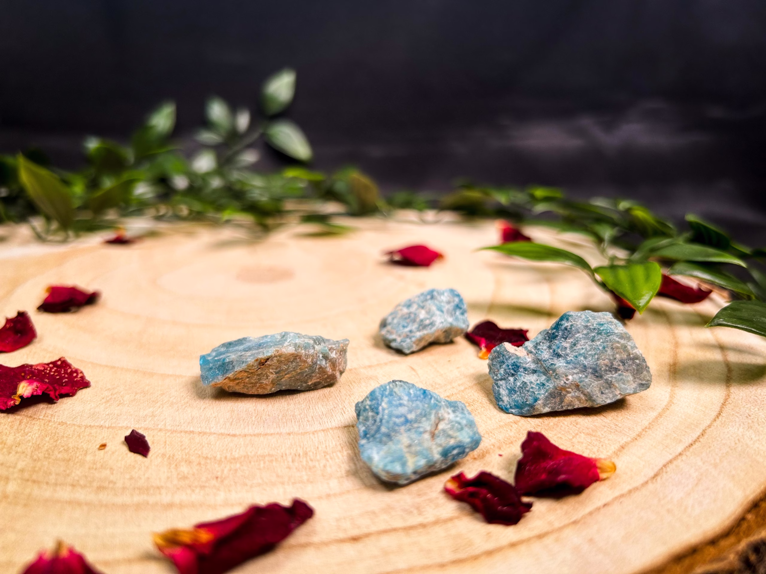 Modri apatit je mineral kalcijevega fosfata, ki ga najdemo v različnih barvah, kot so rumena, modra, zelena, siva in rjava. Apatit je leta 1786 prvič odkril A.G. Werner, vendar je njegovo ime izhajalo iz grške besede, ki pomeni »prevarati«, ker ga je veliko ljudi zamenjevalo z drugimi minerali, kot sta peridot in beril. Modri apatit je kristal manifestacije. Stimulira intelekt, omogoča globljo refleksijo in notranjo jasnost. Apatit nas spodbudi k iskanju »svobode«. Če ga položimo pod vzglavnik, povečuje moč in pogostost lucidnih sanj. Prav tako pomagal pri astralnih projekcijah. Je odličen meditacijski kristal, ki vas poveže z vašimi vodniki in vam pomaga pri komunikaciji z njimi. Vsi, ki delate na krepitvi in odklepanju svoje najvišje intuicije, je modri apatit kristal za vas. Največje nahajališče apatita je v Rusiji, vendar ga lahko najdemo tudi v Braziliji, na Madagaskarju in v Mehiki.